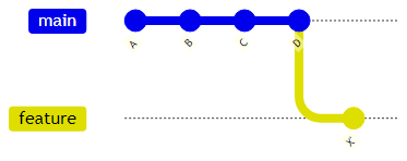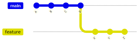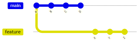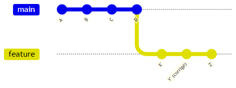 Une fois la feature développée, la branche main a eu les commit B, C et D et feature/ma-feature a eu les commit X, Y et Z.