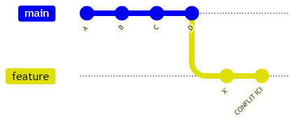 Il se trouve que le commit Y a modifié le même fichier qu’un commit de la branche main. Il y aura donc un conflit lors du merge.