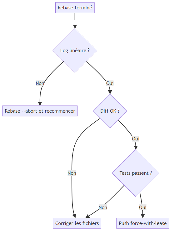 C’est une étape cruciale. Après un rebase (et surtout après avoir résolu des conflits), il est indispensable de vérifier deux choses :